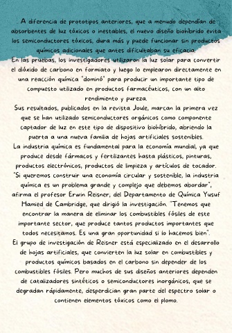 de hojas artificiales, que convierten la luz solar en combustibles y