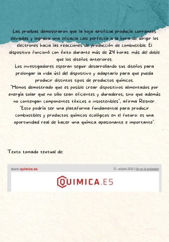 Las pruebas demostraron que la hoja artificial producía corrientes